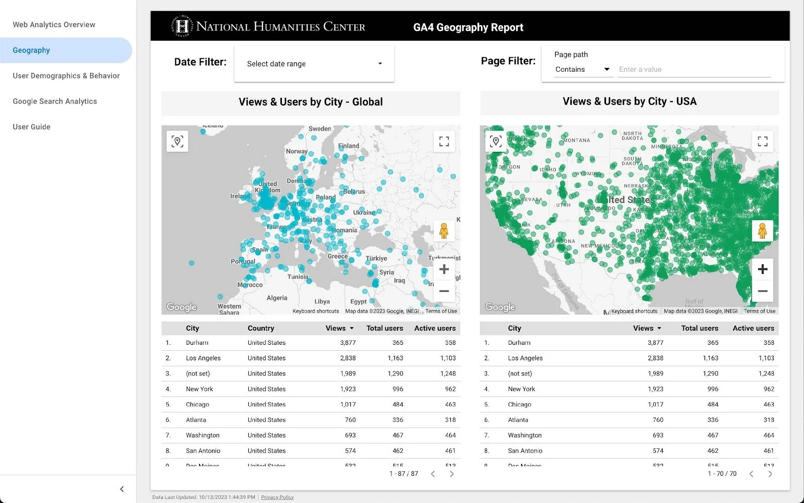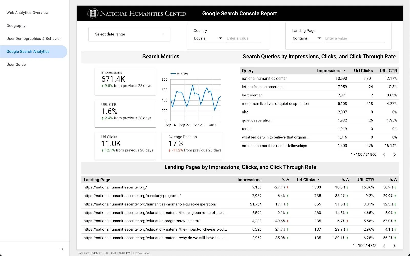 The National Humanities Center (NHC) is a national non-profit devoted to advancing significant humanistic study with 6 web domains featuring over 5,500 pages of content. In this project, I archived historical data from Google Analytics 360, surveyed internal stakeholders to assess information needs, and designed a series of Looker Studio reports and user guides for Google Analytics 4 and Google Search Console data. The reports seek to answer the following questions: Who are our audiences? What do they want? How easy is it for them to find it? What do they do when they find it? What’s the impact of our SEO and digital media activities?